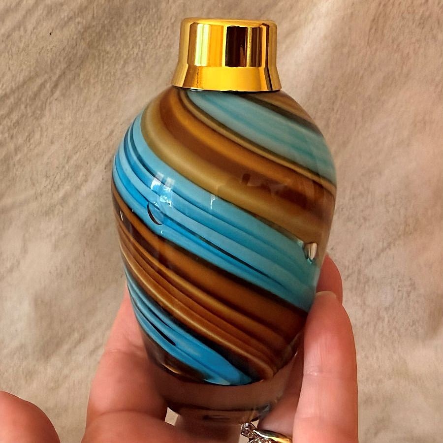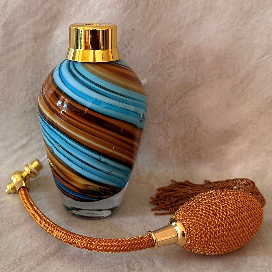 Superbe vaporisateur de parfum fabriqué artisanalement par un artisan souffleur. Le verre est soufflé et travaillé à la main en forme de poire. Le flacon est avec des spirales multicolores de couleur chocolat, bleu, beige et moutarde. Ce nouveau modèle possède des bulles plus ou moins grosses incrustées dans le verre pour donner un effet gouttes d' eau, certaines ne sont pas colorées ce qui fait que vous pouvez voir légèrement votre parfum à l' intérieur (voir la vidéo). Le flacon est d' une contenance de : 100 ml. La finition visserie est en plaqué or avec une poire longue or antique avec métal couleur or.