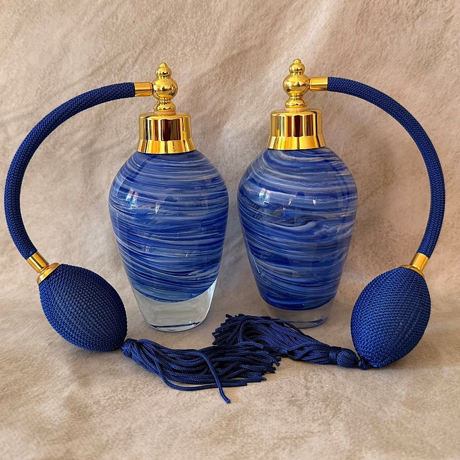 Superbe vaporisateur de parfum fabriqué artisanalement par un artisan souffleur. Le verre est soufflé et travaillé à la main en forme poire. L’intérieur du flacon en verre est teinté à la main un mélange de tons bleu électrique et blanc tout en gardant des parties transparentes vous permettant de voir votre parfum, ce qui donne un effet d' océan. Le flacon est d’une  contenance de : 100 ml. La finition atomiseur est en métal plaqué or avec une poire longue bleue électrique avec métal couleur or.