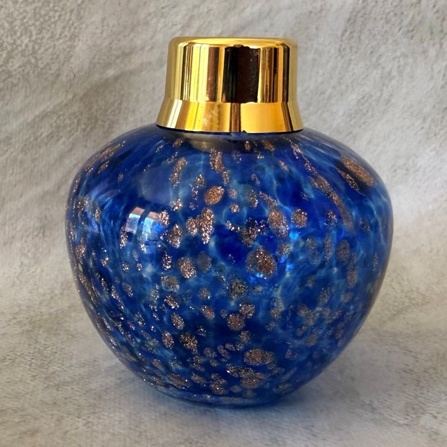 Superbe vaporisateur de parfum fabriqué artisanalement par un artisan souffleur. Le verre soufflé est travaillé à la main en forme de boule. Le flacon en verre soufflé est teinté couleur bleue avec de la poudre or bronze. Le flacon est d’une contenance de : 90 ml. La finition atomiseur est en métal plaqué or avec une poire longue bleue électrique avec métal couleur or.