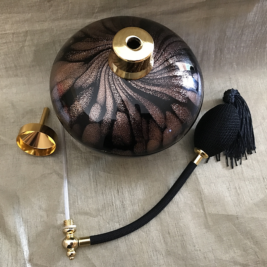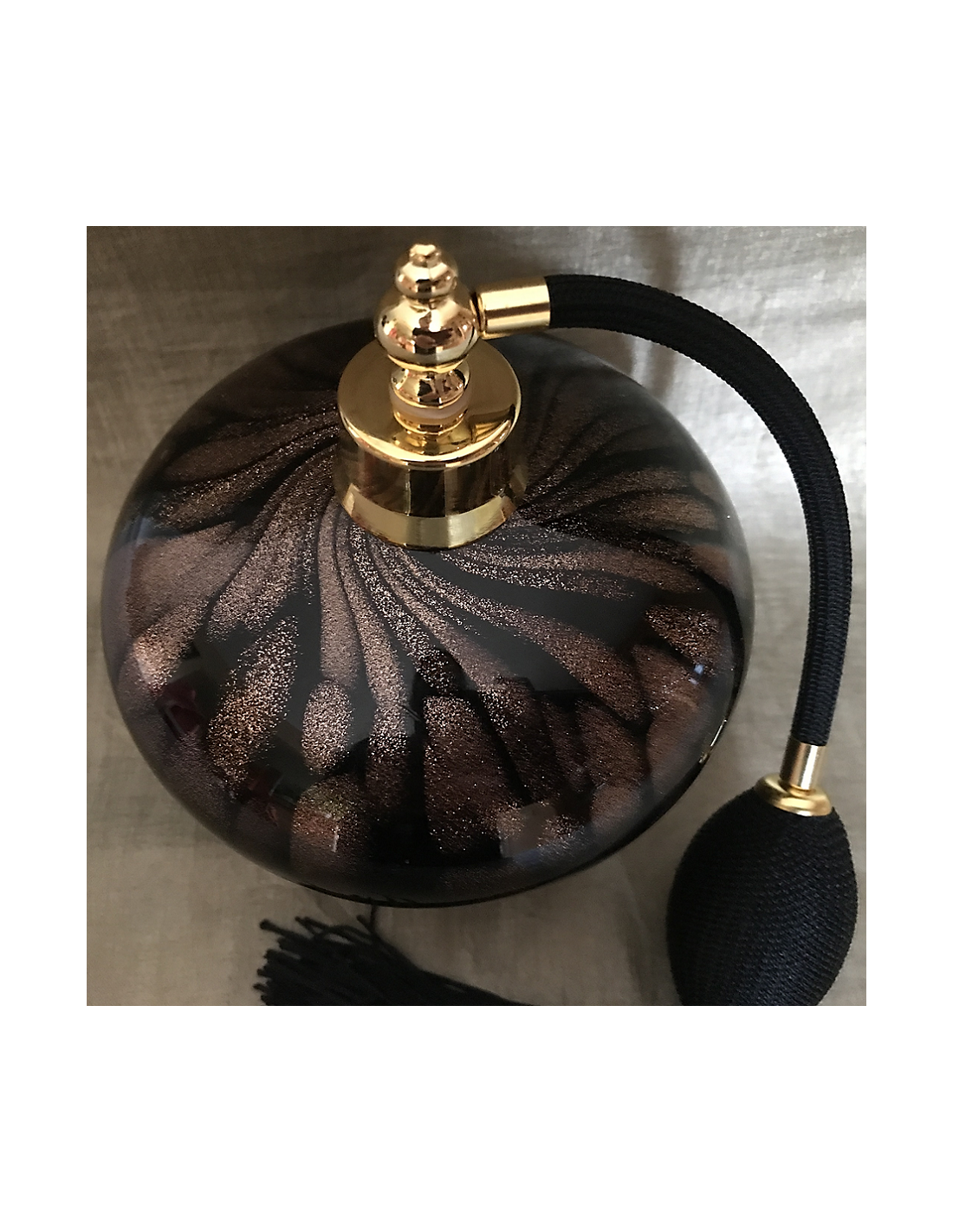 Superbe vaporisateur de parfum fabriqué artisanalement par un artisan souffleur. Le verre est travaillé à la main en forme de boule poire. L' intérieur du flacon en verre est teinté à la main un mélange de tons marron noir avec de la poudre or . Le flacon est d' une grande contenance : 440 ml. La finition atomiseur est en métal plaqué or avec une poire longue noire avec métal couleur or.